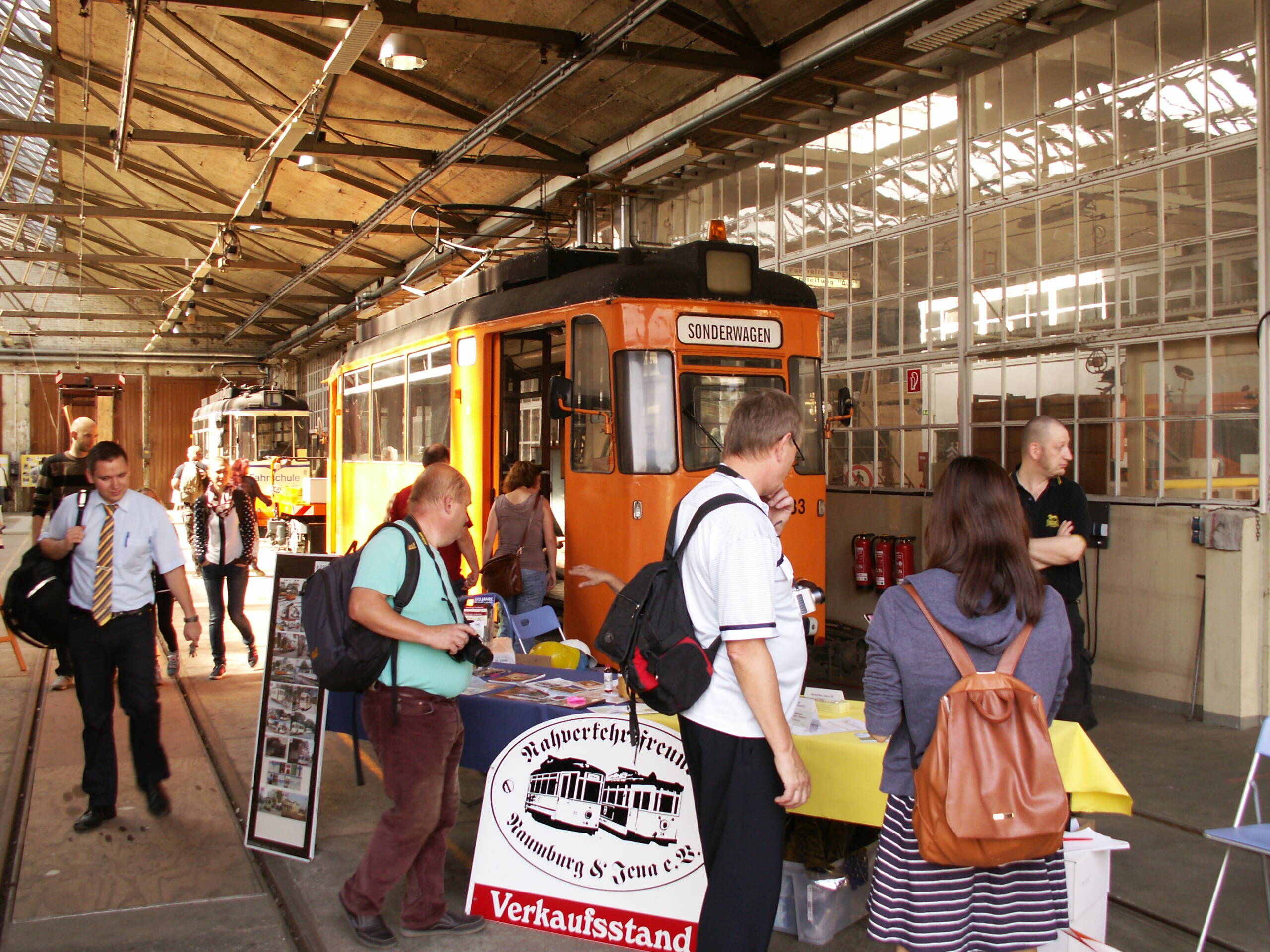 in Zusammenarbeit mit den Stadtwerken und der Nahverkehrsgesellschaft in Jena durchgeführt. Von 13 bis 17 Uhr war das Depot in der Dornburger Straße geöffnet, ausgestellt wurden Infotafeln zum Gebäude sowie zur Geschichte der Straßenbahn. Neben einigen technischen Exponaten konnte auch der Arbeitswagen Typ Gotha von unten besichtigt werden. Eine PowerPoint-Präsentation zeigte Aufnahmen zum Werkstattbetrieb im BBN und ein Rückblick auf das Jubiläum 111 Jahre Jenaer Straßenbahn. Die Partybahn stand vor der Halle und sicherte mit deren Betreiber das Gastronomische Angebot ab. Zwischen Innenstadt (Ernst-Abbe-Platz) und Depot pendelten die historischen Triebwagen 26 und 134 im 30 Minuten Takt. Unser Verein übernahm die Vor- und Nachbereitungen mit Rangierarbeiten und sicherte den Pendelbetrieb und Betreuung im Depot. Rund 220 Besucher in der Halle und knapp 160 Fahrgäste im Pendel wurden gezählt. Ein großer Dank an alle Mitgliedern welche mitgeholfen haben!