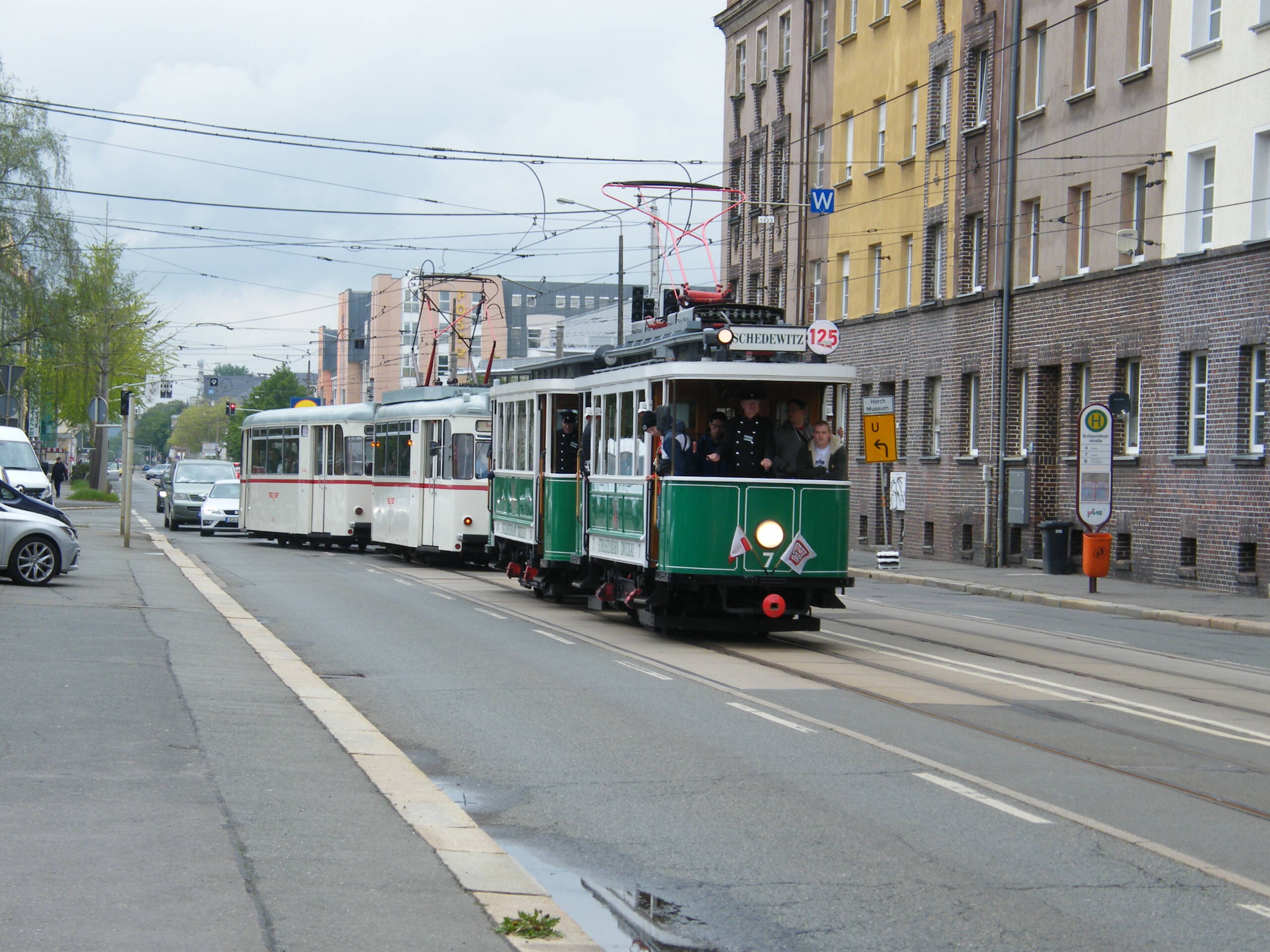 Am 11. Mai fand, wie angekündigt, unsere Vereinsfahrt zum Straßenbahnjubiläum nach Zwickau statt. Leider hatten sich wieder nur sechs Mitglieder zur Teilnahme entschlossen. Das Wetter meinte es am Vormittag auch nicht gut mit den Veranstatern, es regnete in Strömen. Zur Freude aller änderte sich das Wetter ab Mittag und es kam sogar zweitweise die Sonne heraus. Geboten wurde das zu solchen Anlässen übliche Programm, mit vielen Ständen kleineren Showvorfürungen, Eingleisungsvorführung der Feuerwehr, Werkstattführungen und das Bemalen eines Tw durch Kinder. Den Abschluss des Tages bildete ein kleiner Korso mit den historischen Tw 7+Bw 17, dem Gotha-Zug Tw 92+Bw 133, dem Kt4D 947 und den GT6M 904.